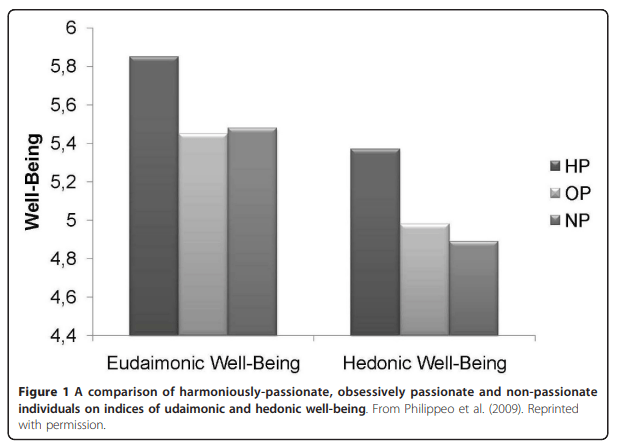 Comparación entre individuos con pasión armónica, pasión obsesiva y sin pasión en indicadores de bienestar eudaimónico y hedónico. De Philippeo et al. (2009). Fuente: Psychology of Well-Being