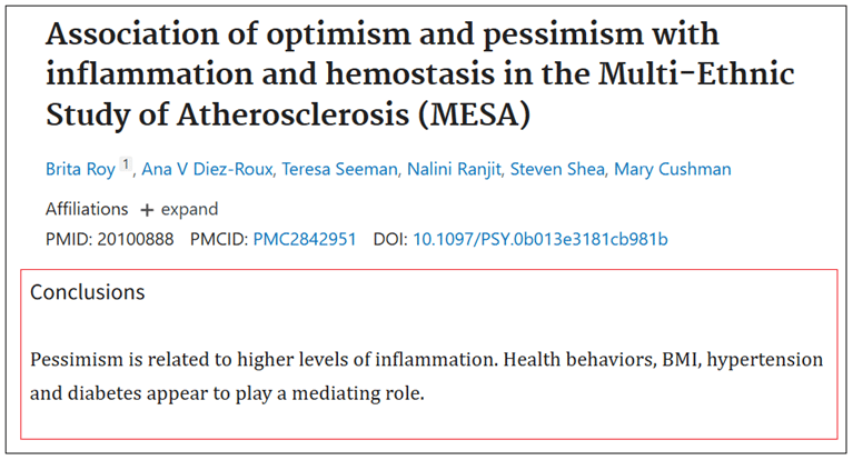Association of optimism and pessimism with inflammation and hemostasis in the Multi-Ethnic Study of Atherosclerosis (MESA).