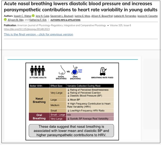Acute nasal breathing lowers diastolic blood pressure and increases parasympathetic contributions to heart rate variability in young adults. Zelano C et al. Am J Physiol Regul Integr Comp Physiol. 2023. doi: 10.1152/ajpregu.00148.2023.