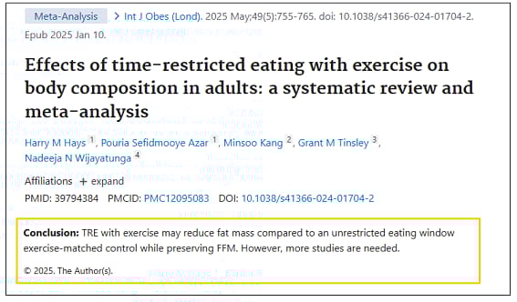 Su conclusión es: La alimentación con restricción horaria (TRE) combinada con ejercicio puede reducir la masa grasa en comparación con un grupo control con ventana de alimentación libre y ejercicio equivalente, mientras preserva la masa libre de grasa.
