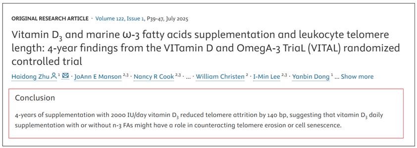 Cuatro años de suplementación con 2.000 UI/día de vitamina D₃ redujeron el acortamiento de los telómeros en 140 pares de bases, lo que sugiere que la vitamina D₃ diaria, con o sin ácidos grasos omega-3, podría desempeñar un papel en la reducción de la erosión telomérica o la senescencia celular.