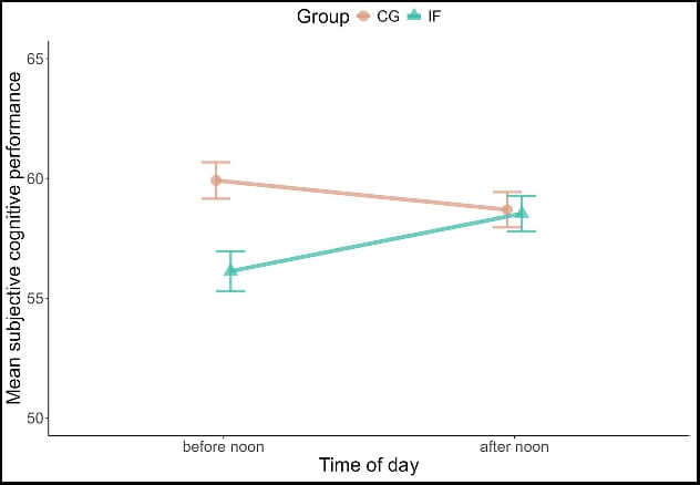 La sensación de “niebla” no implica peor funcionamiento mental. CG = grupo control (sin ayuno) · IF = ayuno intermitente 16:8. Fuente estudio: Sage Journals