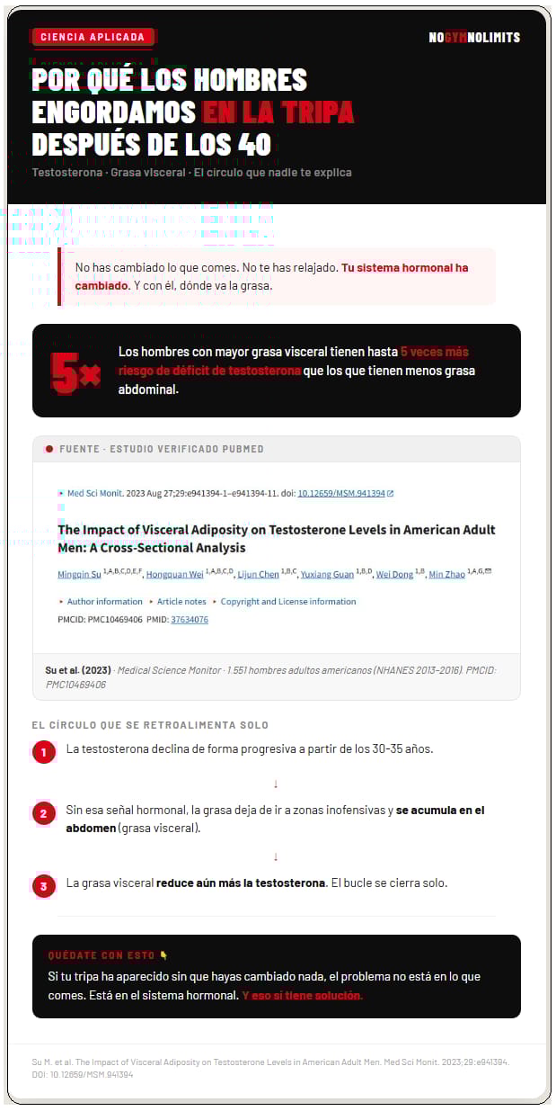 Referencias: — Su, M. et al. (2023). The Impact of Visceral Adiposity on Testosterone Levels in American Adult Men: A Cross-Sectional Analysis. Medical Science Monitor, 29, e941394. DOI: 10.12659/MSM.941394 — Lovejoy, J.C. et al. (2008).