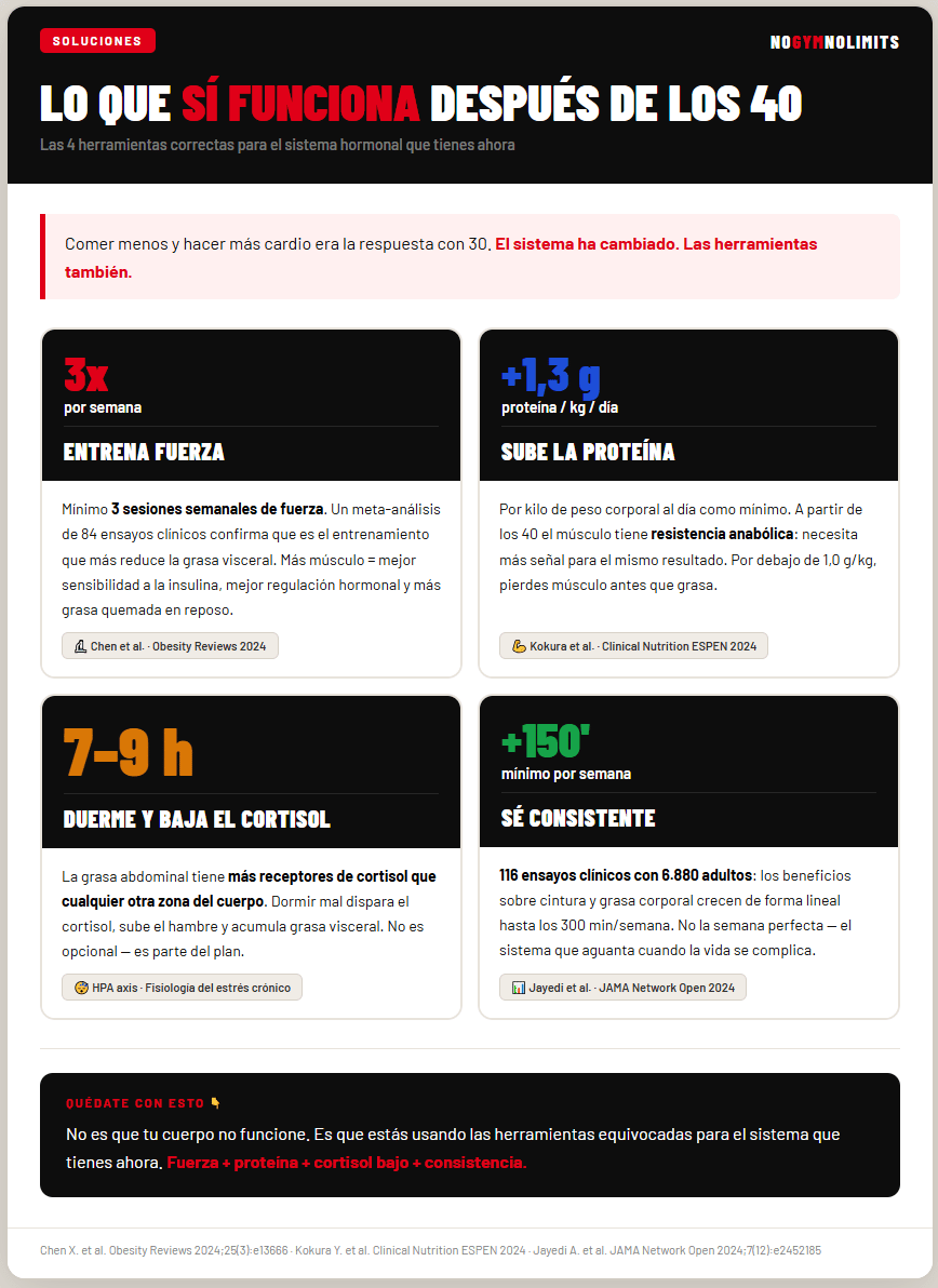 Entrenamiento de fuerza. El músculo es el órgano metabólico más importante que tienes. Más músculo significa mejor sensibilidad a la insulina, mejor regulación hormonal y más capacidad de oxidar grasa en reposo. Un meta-análisis de 84 ensayos clínicos confirmó que el entrenamiento de fuerza reduce significativamente la grasa visceral, especialmente en hombres.