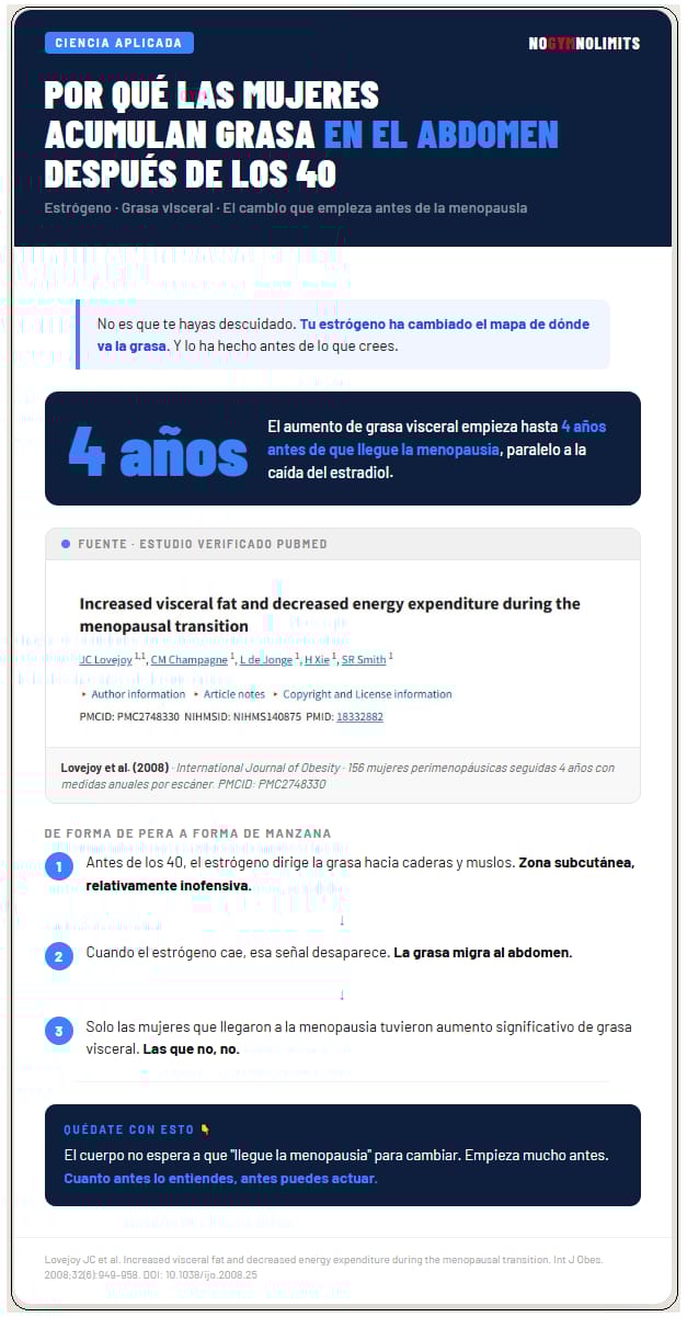 Cuando el estrógeno cae y empieza a caer bastante antes de la menopausia, a veces desde los 40, esa señal desaparece. La grasa deja de ir a las caderas y empieza a acumularse en el abdomen. El patrón cambia de "pera" a "manzana".